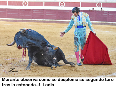 Morante de la Puebla: estocada atravesada y descabello (silencio); y